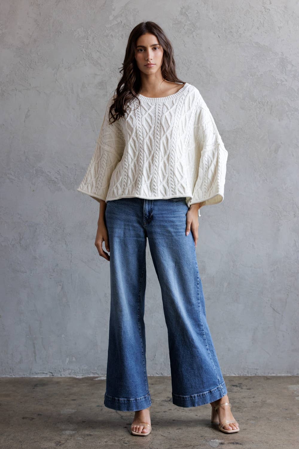 Cozy meets chic in the Everly Cable Knit Sweater. The rich cream hue beautifully highlights the dimensional texture of the knit, making it a standout layering piece. Designed with a relaxed, boxy fit and slightly cropped silhouette, this pullover pairs perfectly with high-waisted jeans, skirts, or leggings. Wide bell sleeves add a playful, fashion-forward touch, while the classic crew neckline with ribbed detailing keeps it timeless. Crafted from a soft 60% cotton and 40% acrylic blend, itβs as comfortable as it is stylish.